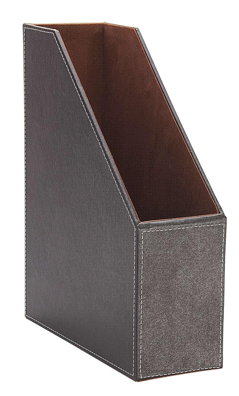 Hofferruffer magazine holder, foldable magazine rack, pu leather desktop organizer for document file folder, great for table, reception desk, home or office, brown faux leather. With its streamlined metal frame and leather hammock this sophisticated floor magazine rack is begging to be introduced to a contemporary or modern space. Metal & faux leather magazine holder: Our magazine file holder is made of a metal frame and faux leather sheath. If you decor craves a more masculine accessory, this magazine rack has you covered with its faux leather holder.